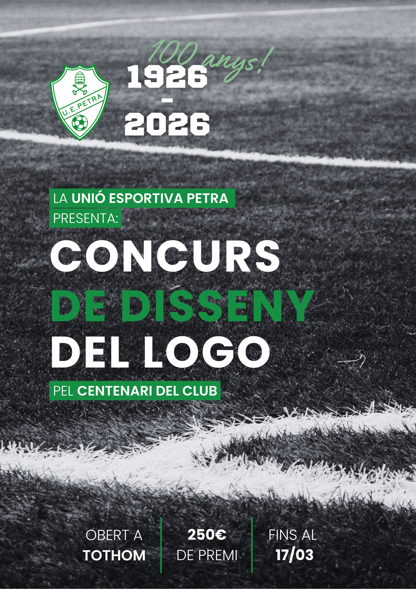 Aquest 2025, la Unió Esportiva Petra celebra 100 anys d'història! Un segle de passió pel futbol, de moments inoblidables i de jugadors i aficionats que han fet créixer aquest club any rere any. Per commemorar aquesta fita tan especial, llança'm un concurs de disseny per crear el logo oficial del Centenari de la U.E. Petra.